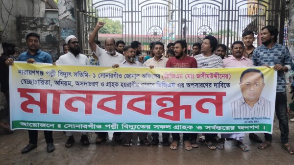 নারায়ণগঞ্জ সোনারগাঁয় পল্লী বিদ্যুৎ-১ ডেপুটি জেনারেল ম্যানেজার ( ডিজিএম) মোঃ জসীম উদ্দিনের অপসারণের দাবিতে মানববন্ধন ও বিক্ষোভ করেছে গ্রাহক ও সাধারণ মানুষ। বৃহস্পতিবার দুপুরে উপজেলা পরিষদের প্রধান ফটকের সামনে এ