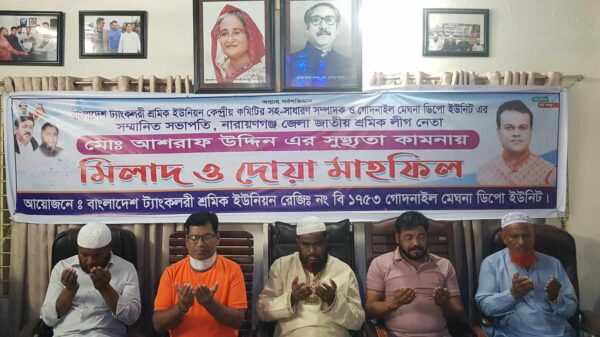 বাংলাদেশ ট্যাংকলরী কেন্দ্রীয় কমিটির যুগ্মসাধারণ সম্পাদক, গোদনাইল মেঘনা ডিপো শাখার সভাপতি ও দৈনিক জনদর্পণ পত্রিকার প্রকাশক আশরাফ উদ্দিনের সুস্থতা কামনায় নাসিক ৬নং ওয়ার্ডে ট্যাংকলরী শ্রমিক ইউনিয়ন গোদনাইল মেঘনা ডিপো ইউনিটের