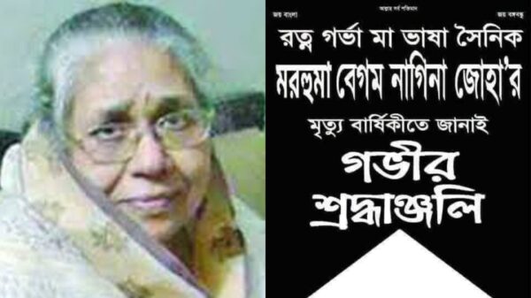 প্রেস বিজ্ঞপ্তি : ভাষা সৈনিক, মুক্তিযুদ্ধের অন্যতম সংগঠক, স্বাধীনতা পদক প্রাপ্ত ও সাবেক সংসদ সদস্য একেএম শামসুজ্জোহার সহধর্মীনি, রত্নগর্ভা মা নাগিনা জোহার ৮ম মৃত্যুবার্ষিকীতে গভীর শ্রদ্ধা জানিয়েছেন মরহুম আলী হোসেন