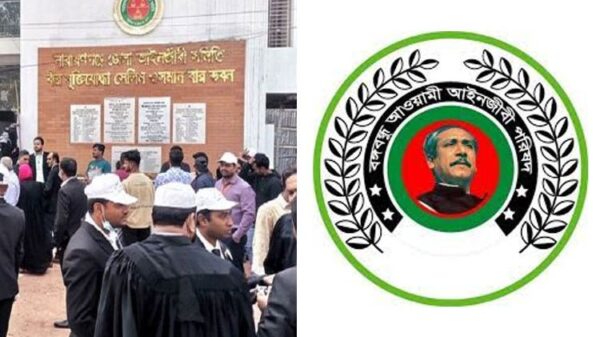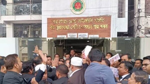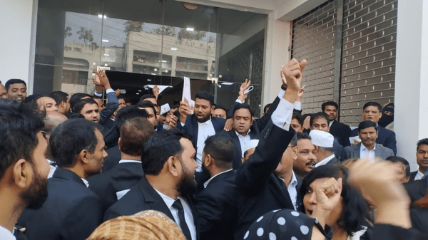 নারায়ণগঞ্জে জেলা আইনজীবী সমিতি নির্বাচনকে ঘিরে আদালতপাড়ায় আওয়ামীলীগ ও বিএনপিপন্থী আইনজীবীদের পাল্টাপাল্টি মিছিল হয়েছে। এসময় উভয় পক্ষের শ্লোগান পাল্টা শ্লোগানে সেখানা উত্তপ্ত পরিস্থিতির তৈরী হয় । আজ বৃহস্পতিবার (১১ জানুয়ারি)
