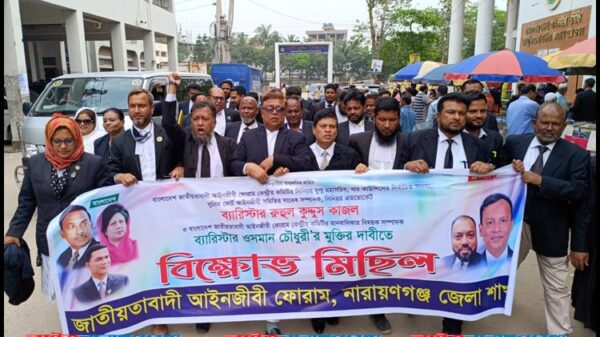 জাতীয়তাবাদী আইনজীবী ফোরাম কেন্দ্রীয় কমিটি ঘোষিত জাতীয়তাবাদী আইনজীবী ফোরামের সিনিয়র যুগ্ম-মহাসচিব ব্যারিস্টার রুহুল কুদ্দুস কাজল ও মানবাধিকার সম্পাদক ব্যারিস্টাার ওসমান চৌধুরীর মুক্তির দাবীতে বিক্ষোভ মিছিল করেছে নারায়ণগঞ্জ জেলা জাতীয়তাবাদী আইনজীবী