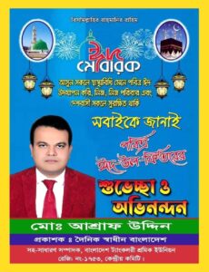পবিত্র ঈদুল ফিতর উপলক্ষে নারায়ণগঞ্জবাসী সহ দেশ-বিদেশে অবস্থানরত সকলকে ঈদুল ফিতরের শুভেচ্ছা ও “ঈদ মোবারক” জানিয়েছেন বাংলাদেশ ট্যাংকলরী শ্রমিক ইউনিয়ন কেন্দ্রীয় কমিটির যুগ্ম-সাধারণ সম্পাদক ও দৈনিক স্বাধীন বাংলাদেশ পত্রিকার প্রকাশক আশরাফ উদ্দিন।